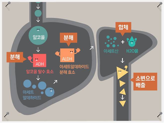 술의 주성분은 물과 에탄올입니다. 위와 소장에서 흡수된 에탄올은 우리 몸의 해독 기관인 간에서 ADH(알코올 탈수 효소)에 의해 분해돼 아세트알데하이드가 됩니다. 아세트알데하이드는 다시 ALDH (아세트알데하이드 분해 효소)에 의해 아세트산과 물로 분해된 뒤 소변으로 배출됩니다.