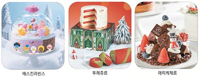 캐릭터는 없어도 업체들은 크리스마스 케이크 신제품을 쏟아내고 있다. CJ푸드빌 뚜레쥬르는 '매지컬 크리스마스(Magical Christmas)'라는 콘셉트로 50여 종을 출시했다. 대표 제품 '블랑 골드 레이어'는 레드와 화이트 시트에 상큼한 자몽맛 생크림을 바른 후 화이트 초콜릿 가나슈로 코팅한 케이크다. 눈이 하얗게 덮인 것 같은 외관과는 달리 케이크를 자르면 알록달록한 단면이 눈길을 끈다. '레드 산타 초코'는 블랙 초콜릿 시트와 레드 시트에 산딸기 가나슈를 바르고 레드 초콜릿을 분사해 산타 모양으로 만든 케이크다.
