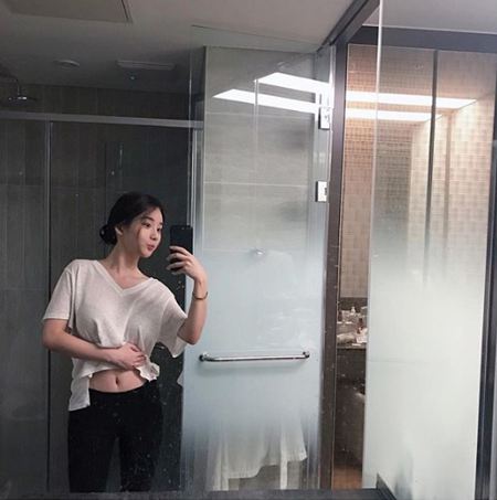 공개된 사진에는 흰색 브이넥 티와 검은색 레깅스 바지를 입고 늘씬한 몸매를 자랑하는 한서희의 모습이 담겼다. 그는 거울 앞에서 우스꽝스러운 표정으로 셀카를 찍어 보는 이들의 시선을 사로잡았다.