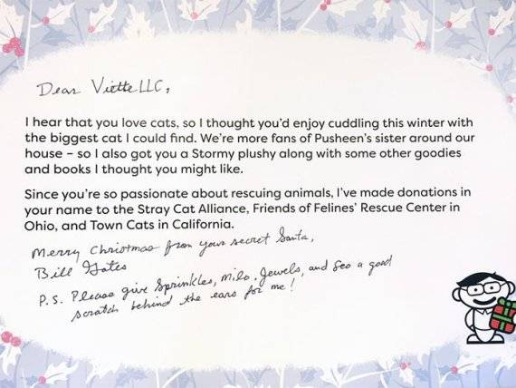 그럼 빌 게이츠의 크리스마스 선물은 뭘까. 상자 안에는 빌 게이츠의 편지뿐만 아니라 거대한 고양이 쿠션이 들어 있었다. 이어서 각종 비즈니스 책과 150달러의 기프트 카드, 티셔츠, 액자 등 다양한 선물이 가득했다.