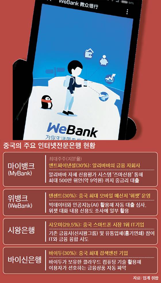 알리바바그룹이 지난해 5월 선보인 마이뱅크(왕상은행·網商銀行)도 상황이 비슷하다. 그룹 내 금융 자회사인 ‘앤트파이낸셜(Ant-Financial)’이 최대주주가 돼 중금리 대출 영업을 공격적으로 개시했다. 지난해 6월까지 마이뱅크가 확보한 중소기업 고객만 170만 곳, 이들에게 나간 대출 잔액이 230억 위안에 달한다. 이 중 부실대출 비율은 0.36%로 위뱅크보다 더 낮다.