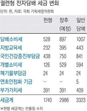 나아가 앞으로 궐련형 전자담배에 붙는 다른 세금과 부담금도 일반 담배의 90% 수준으로 오를 것으로 예상된다. 현재 궐련형 전자담배에 개별소비세·담배소비세·지방교육세 등 세금(각종 부담금 포함)은 1갑당 1739원으로, 일반담배 세금(3323원)의 52.3%다.