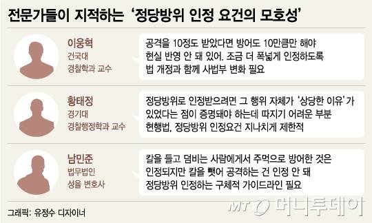 남 변호사도 "선제 공격이 아니고 무기를 소지 하지 않은 사람이 대응하는 경우 등 정당방위를 인정하는 구체적 가이드라인도 필요하다"고 밝혔다.