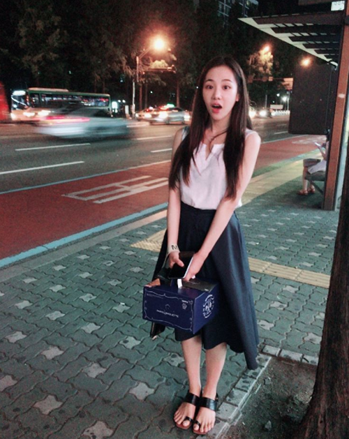 사진 속 한지은은 버스정류장에서 깜짝 놀란 표정으로 카메라를 바라보고 있다. 그는 민소매 티와 롱 스커트를 입고 캐주얼한 패션 감감을 뽐냈다.