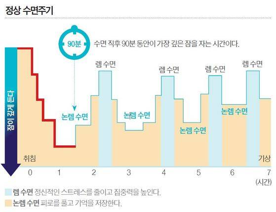 ━ 첫 논렘 수면 망치면 밤새 불안정 우리 몸은 하루 중 깨어 있는 시간이 길어질수록 자고 싶은 욕구가 커진다. 이 욕구를 ‘수면 압력’이라고 부른다. 수면 압력은 잠이 든 후 90분 동안, 즉 수면의 골든타임 때 가장 많이 방출된다. 미국 스탠퍼드대 수면생체리듬(SCN)연구소의 니시노 세이지 교수는 “수면 골든타임 때 숙면을 취하면 수면 압력이 크게 줄어 자고 싶은 욕구가 해소되고 피곤함이 줄어든다”고 설명했다.