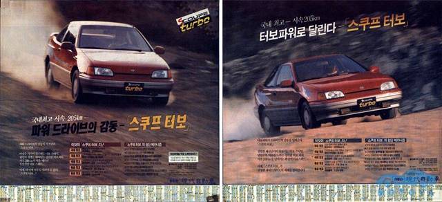 알파 엔진으로 약간의 성능 향상을 이룩한 스쿠프는 같은 해에 또 하나의 국내 최초 타이틀을 하나 더 갖게 된다. 그것은 바로 ‘국산차 최초의 (가솔린)터보엔진 탑재’다. 현대자동차는 91년 10월, 알파 엔진에 터보차저를 올린, ‘스쿠프 터보’를 내놓았다. 스쿠프 터보의 엔진은 91년형 스쿠프를 통해 성능을 검증한 알파 엔진에 터보차저를 적용한 것으로, 알파 엔진에 비해서 27마력이나 높은 129마력의 최고출력을 발휘했다. 강력한 심장 은 곧 성능의 향상으로 이어졌고, 0-100km/h 가속 시간은 약 9.18초를 기록, 스쿠프 알파에 비해 2초 가량 단축시켰다. 최고속도는 200km/h를 넘어섰다.