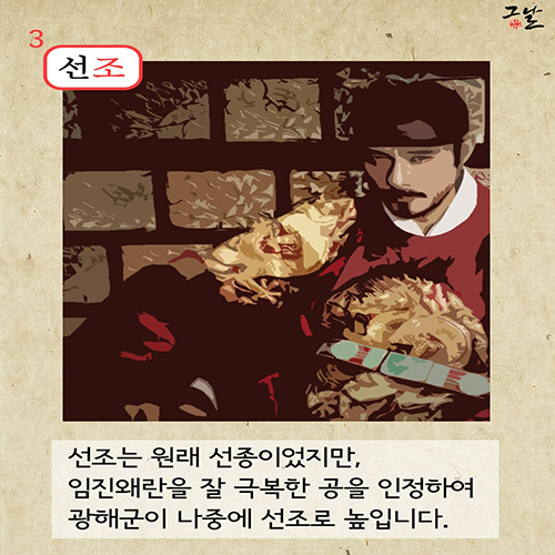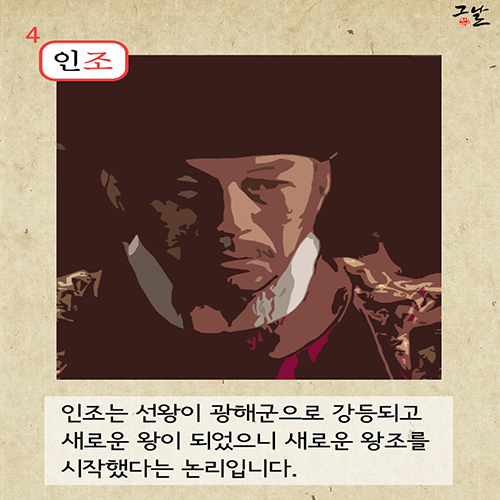 선조는 원래 선종이었지만, 임진왜란을 잘 극복한 공을 인정해 광해군이 나중에 '선조'로 높입니다. 인조는 선왕이 광해군으로 강등되고 새로운 왕이 되었으니 새로운 왕조를 시작했다는 논리입니다.