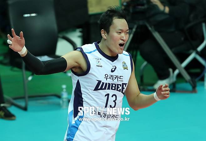 [스포티비뉴스=안산, 한희재 기자] OK저축은행과 우리카드의 2017-2018 도드람 V리그 남자부 경기가 13일 오후 경기도 안산시 상록수체육관에서 열렸다. 득점을 올린 우리카드 구도현이 기뻐하고 있다.