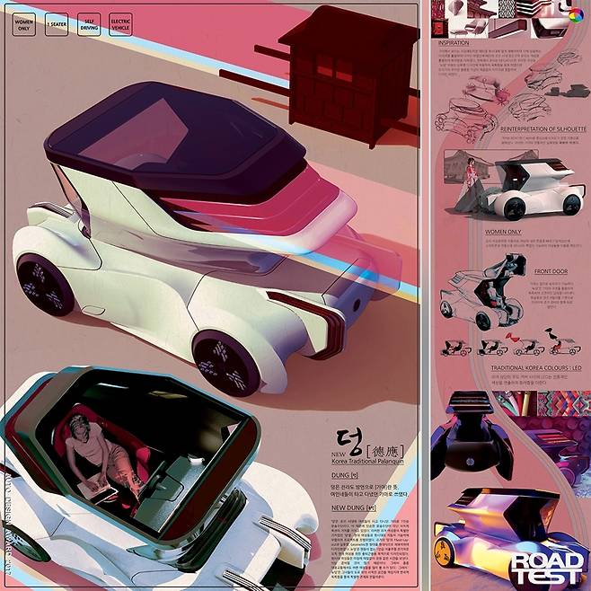 영예의 대상은 한서대학교 산업디자인과에 재학 중인 조정인 씨가 거머쥐었다. 수상작인 <덩[德應] Korea Traditional Palanquin>은 조선 시대 여성들이 타고 다니던 가마의 한 종류인 ‘덩’이라는 운송수단에서 영감을 얻었다. 덩의 역할과 조형 언어들을 밑바탕 삼아 미래의 1인용 자율주행 자동차로 재해석했다. 가마와 비슷한 승하차 방식이 흥미롭다.