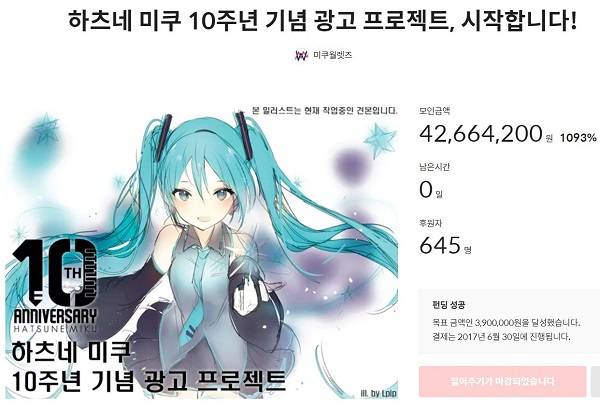 | ▲ 하츠네 미쿠 10주년 기념 광고 프로젝트가 텀블벅에서 크라우드 펀딩을 받고 있다. |