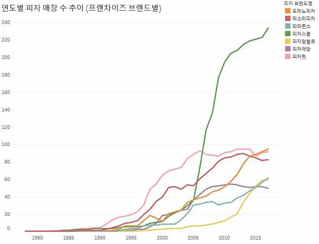 후발 주자지만 확장세는 무서웠습니다. 매장 수가 수직 상승한 2000년대에도, 경쟁 브랜드와 비슷한 신규 개점 수를 보인 2010년대에도창업자는 '빅3'나 여타 저가 브랜드보다 피자스쿨을 더 선호했다는 뜻입니다.