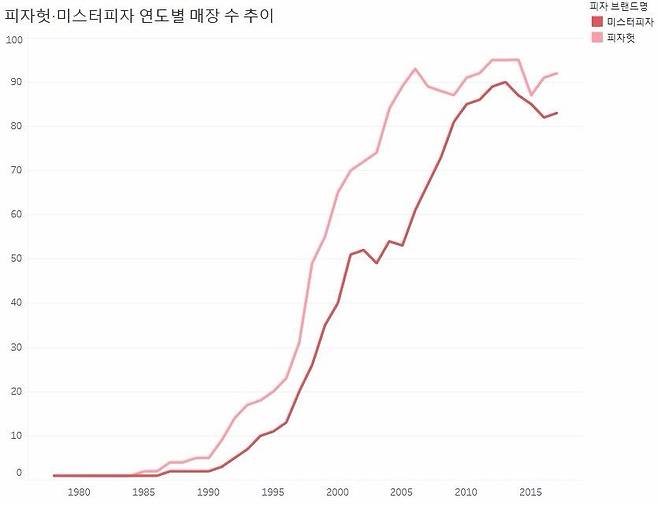 미스터피자는 2013년 가맹점 90개로 최고점을 찍은 뒤 3년 연속 감소해 82개까지 줄었습니다. 지난해 2군데가 늘어 현재는 82곳입니다. 피자헛 역시 2012년 서울 내 95개 매장이 최다였습니다. 이후 2014년까지 증감없이 95곳을 유지한 뒤 2015년 87곳으로 8곳이 사라졌습니다. 2016년 단 2곳이 늘어 91곳이 영업 중일 뿐이죠. 이미 피자 프랜차이즈가 포화상태, 즉 성장 한계에 다다랐다는 분석이 가능합니다.