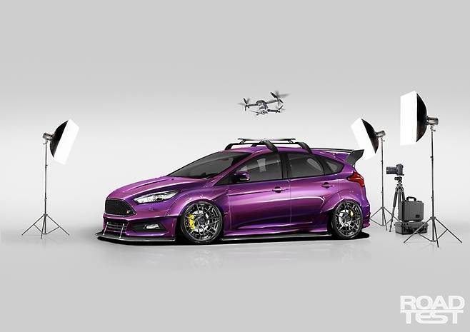 포드에선 총 3가지 포커스를 무대에 올린다. 그 중에서 가장 멋진 모델은 바로 이 차. 2017년형 포커스 ST를 밑바탕 삼아 완성도를 높였다. 보닛 속엔 직렬 4기통 2.0L 가솔린 터보 에코부스트 심장을 얹었다. 여기에 보그 워너사의 EFI 7163 터빈을 짝지었다. 보랏빛 차체와 형광색 브레이크 캘리퍼도 남다른 존재감을 건드는 요소다.
