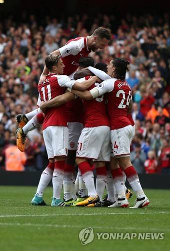 epa06194152 Arsenal's players celebrate during the English Premier League soccer match between Arsenal FC and AFC Bournemouth at the Emirates stadium, in London, Britain, 09 September 2017. EPA/NEIL HALL EDITORIAL USE ONLY. No use with unauthorized audio, video, data, fixture lists, club/league logos or 'live' services. Online in-match use limited to 75 images, no video emulation. No use in betting, games or single club/league/player publications