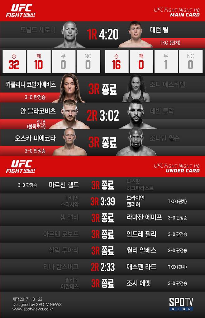 반면 틸은 베테랑 타격가를 잡고 무패 행진(16승 1무)을 이어 갔다. 곧 UFC 웰터급 랭킹에 진입할 것으로 보인다.