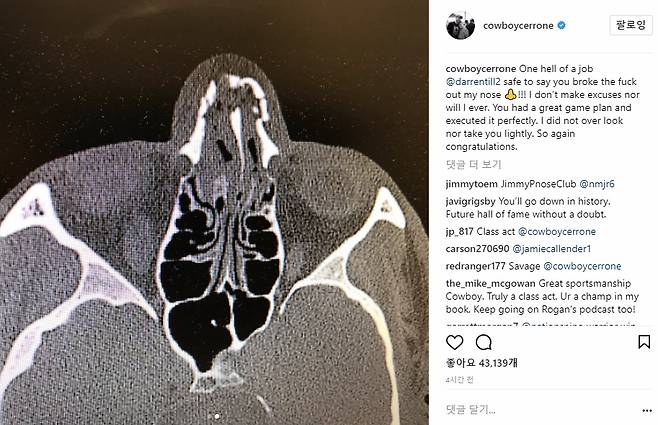 경기 후 인스타그램에 틸의 강력한 오른손 잽을 맞는 사진과 코가 부러져 휜 엑스레이 사진을 함께 올리고 "무시무시한 잽이었다. 강력한 잽 한 방에 코가 부러졌다고 할 수 있다. 변명은 하지 않는다. 앞으로도 그럴 생각이 없다. 틸은 좋은 작전을 들고 나왔고 잘 수행했다. 다시 한 번 승리를 축하한다"고 말했다.