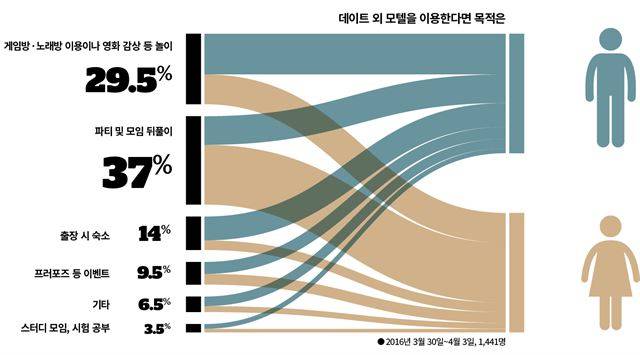 숙박예약 앱 ‘여기어때’를 운영하는 위드이노베이션에 따르면 지난해 데이트 이외의 목적으로 모텔을 찾은 남녀는 전체 응답자의 47%나 됐다. 이들이 모텔을 찾은 이유로는 ‘게임방ㆍ노래방 이용이나 영화 감상 등 놀이’가 가장 많이 꼽혔다. 여성 응답자의 절반은 ‘파티 및 모임 뒤풀이’를 위해 모텔을 찾았다고 했고, 스터디 모임이나 시험 공부를 하기 위해 방문하는 이들도 있었다. 더 이상 모텔은 연인끼리 비밀스럽게 찾는 곳이 아니라는 얘기다.