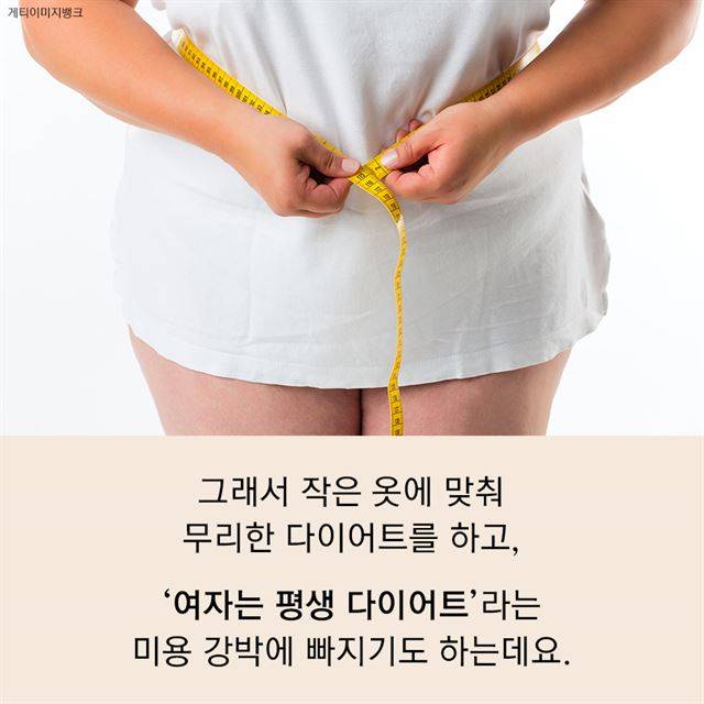 그래서 작은 옷에 맞춰 무리한 다이어트를 하고, '여자는 평생 다이어트'라는 미용 강박에 빠지기도 하는데요.
