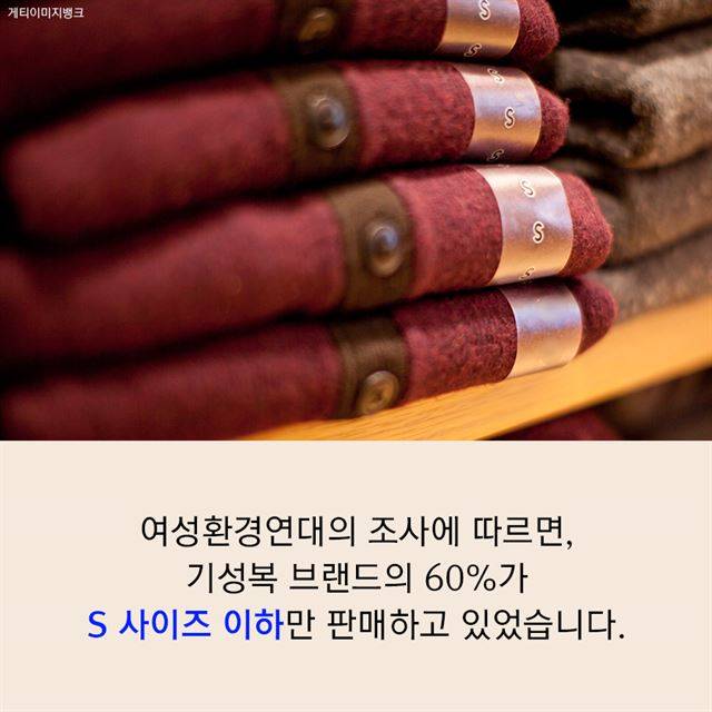 여성환경연대의 조사에 따르면, 기성복 브랜드의 60%가 S 사이즈 이하만 판매하고 있었습니다.