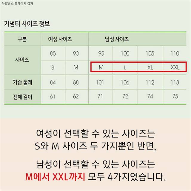 여성이 선택할 수 있는 사이즈는 S와 M 사이즈 두 가지뿐인 반면,