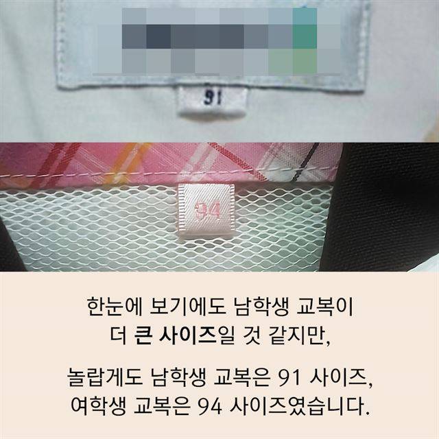 놀랍게도 남학생 교복은 91 사이즈, 여학생 교복은 94 사이즈였습니다.