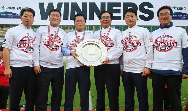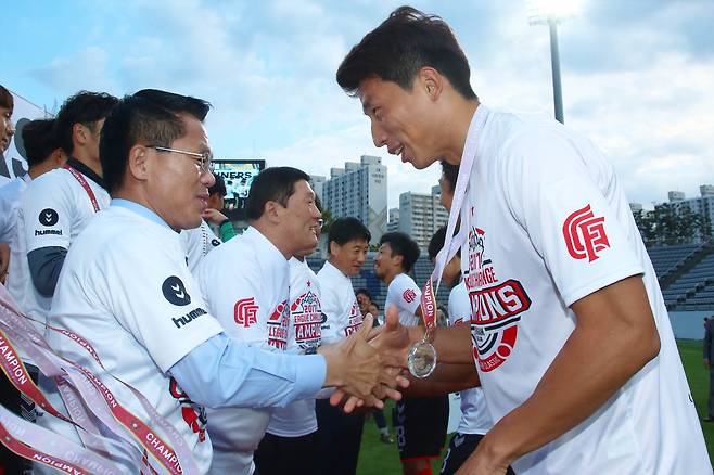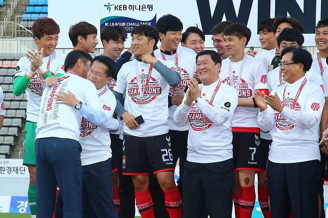 | ▲ 프로축구 경남FC가 14일 오후 창원축구센터에서 치러진 서울이랜드와 경기에서 이겨 승점 73점을 기록하며 남은 경기와 관계 없이 ‘K-리그 챌린지’ 우승을 차지했고, 한경호 경남지사 권한대행이 선수들을 격려하고 있다. |