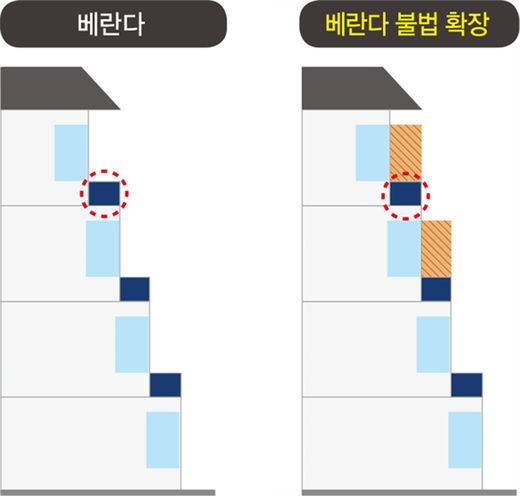 점차 열악해지는 도심의 주거 환경에 비춰 보면 이러한 규정은 마땅히 필요한 최소한의 규정이다. 그럼에도 불구하고 이러한 법령을 위반해도 행정적 제재가 크지 않다는 점을 악용해 불법으로 베란다를 확장하는 행위가 끊이지 않는다. 다른 사람에 대한 배려를 잊은 몰염치한 행동이다.