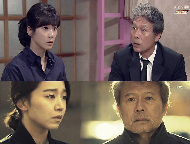 | ▲ <내 딸 서영이>에서 아버지 삼재에게 반감(적개심에 가까운)을 드러내는 서영이(사진 위). <황금빛 내 인생>에서 아버지 태수를 마주하고 뒷걸음 치는 지안(사진 아래). 두 드라마 모두 아버지와 딸 사이의 관계는 틀어져 있다. |