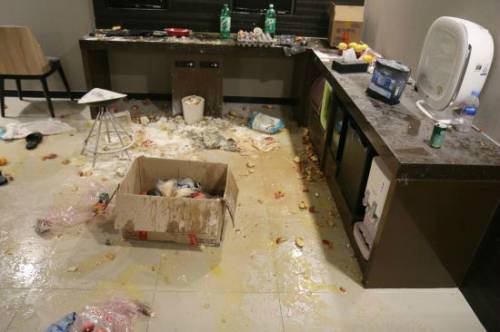 | 모텔에서 인터넷 개인방송을 진행하다 객실을 훼손한 20대가 경찰에 붙잡혔다. 인터넷 방송이 진행된 부산의 한 모텔 현장 사진. |