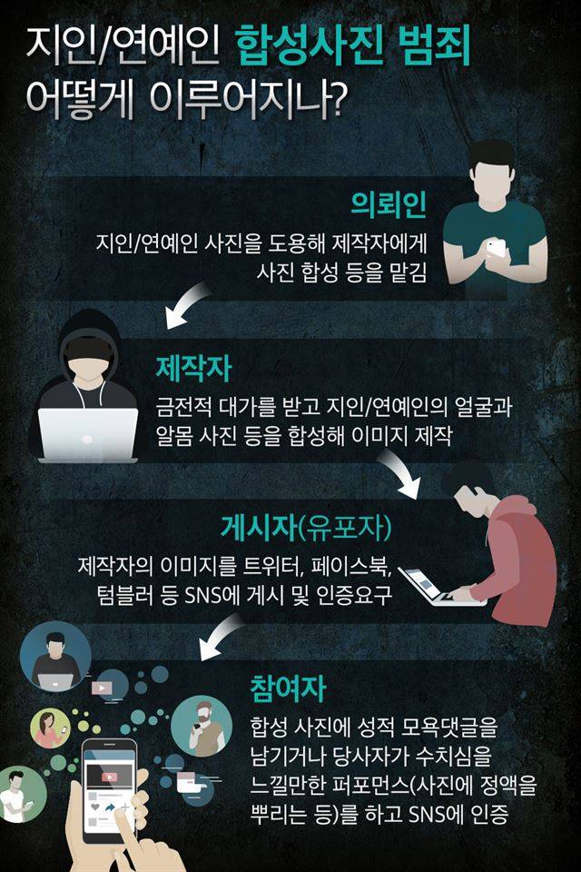 합성음란물 관련 범죄는 단독 범행이 아닌 다수의 가해자가 참여한 집단 성폭력의 양상을 띈다. 예컨대 연예인이나 지인 사진을 무단으로 도용, 음란물과 합성시킨 이후 ‘A는 강간당하는 것을 좋아한다’며 모욕을 요청하는 ▦의뢰자와 의뢰자에게 문화상품권 등 금전적 대가를 받고 합성음란물을 만드는 ▦제작자, 합성음란물을 트위터, 텀블러 등 SNS 계정에 피해자의 신상정보, 성적 모욕글과 함께 공개하는 ▦게시자, SNS 계정에 올라온 합성음란물에 성적 모욕글을 달며 재배포하거나 합성음란물에 정액 등을 뿌리고 그 사진을 인증하는 ▦참여자 등의 역할로 나뉜다.