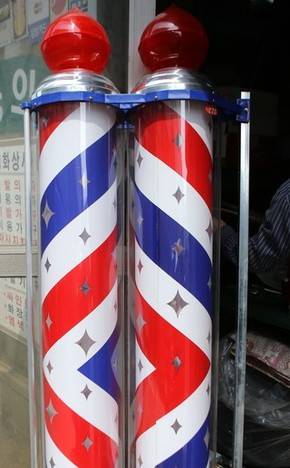 이발소를 상징하는 원통형 회전간판에는 빨강·파랑·하양 3색이 쓰인다.