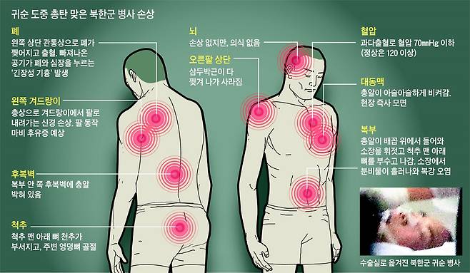 JSA로 귀순하다 40여발의 총탄 사격을 받은 북한군 병사는 폐와 복부 등에 5~6발의 총상으로 다발성 장기 손상을 입어 위중한 상태에 놓여 있다. 13일 응급 수술로 출혈은 멈췄지만, 복부를 관통한 총상으로 소장이 훼손되고 분변과 분비물이 복강 내로 흘러나와 복막염으로 인한 패혈증 발생이 우려되는 상황이다. 총알 한 개는 제거되지 못한 채 복부 깊숙한 곳에 박혀 있다.