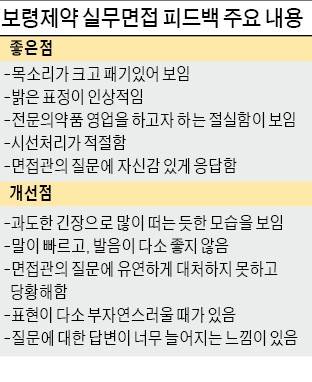 피드백 내용은 보완이 필요한 부분뿐만 아니라 우수한 부분 두 가지로 나눠 제시한다. 실제로 피드백을 받은 지원자의 성적표를 보면 ‘목소리가 크고 패기 있어 보임’ ‘밝은 표정이 인상적임’ ‘시선 처리가 적절함’ ‘전문의약품(ETC) 영업을 하고자 하는 절실함이 보임’ 등 지원자별 장점이 자세히 기술돼 있다. 탈락자들은 ‘상황 대처 능력 부족’ ‘발음 등 면접 기본 소양 부족’ 등이 가장 많이 지적된 것으로 나타났다. 과도한 긴장으로 많이 떠는 모습을 보이거나 질문에 유연하게 대처하지 못해 당황한 경우가 많이 꼽혔다.