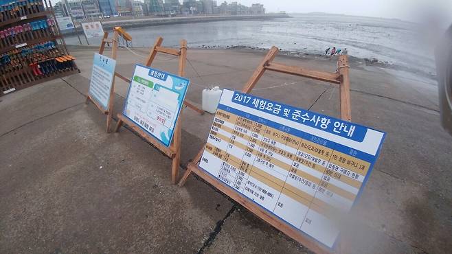 | ▲ 조개캐기학습체험 요금은 중학생 이하는 5천원 어른은 7천원 이었습니다. 갯벌 축구와 발 야구도 즐길 수 있다고 했습니다. |