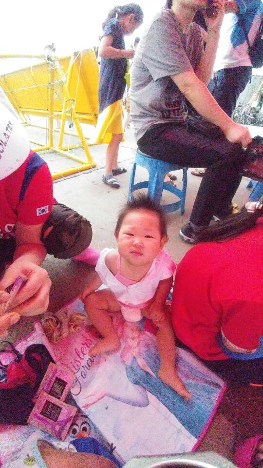 | ▲ 갑자기 소나기가 내리면서 그늘막 안으로 들어왔는데 기저귀를 찬 아기의 표정이 재미 있습니다. |
