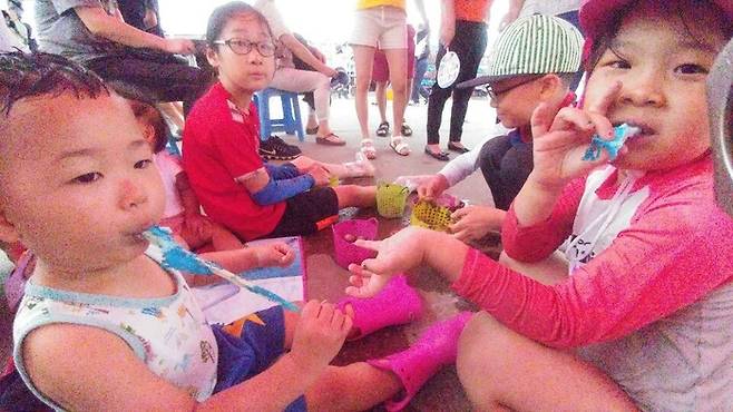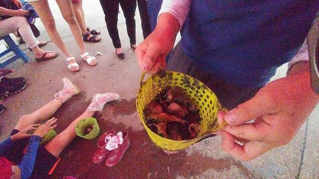 | ▲ 아이들은 자신들이 잡아온 조개를 만지면서 무척이나 즐거운 표정을 짓고 있었습니다 |