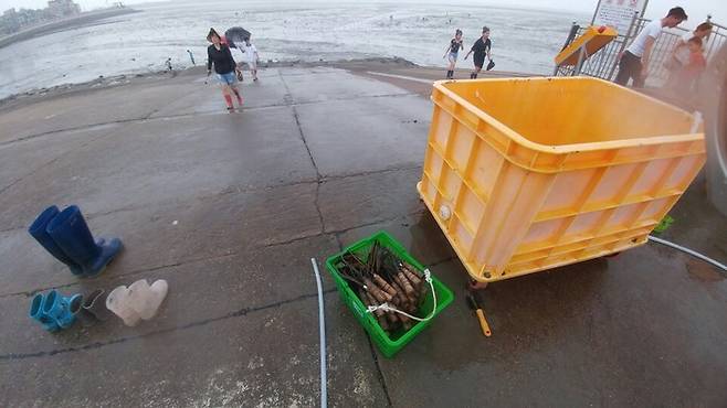 | ▲ 비가 갑자기 내리기 시작하자 사람들이 서둘러 갯벌을 벗어나고 있었습니다. |