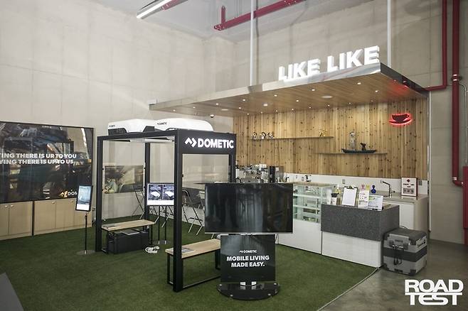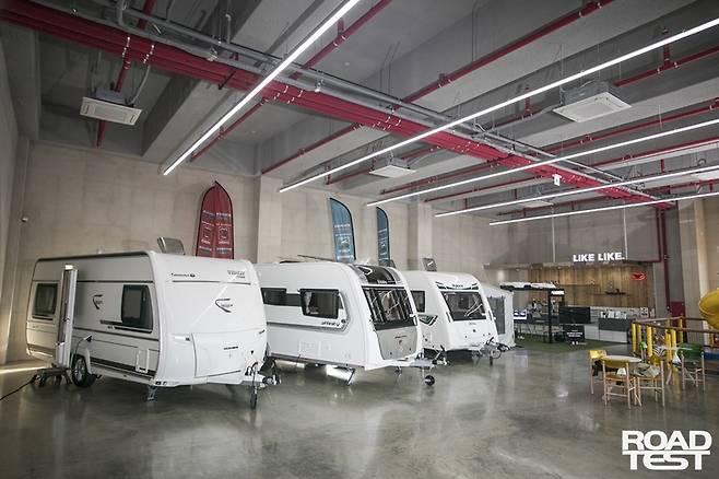그 중에서도 눈에 띄는 업체가 있다.바로 카라반테일이다.자동차 전시장은 많이 다녔지만 카라반 전시장 방문은 처음이다.그런데 낯설지가 않다.대부분 업체들이 컨테이너 또는 외부에 카라반을 전시한다면,카라반테일은 마치 수입차 전시장처럼 안팎을 고급스럽게 꾸몄다.취급하는 브랜드는 엘디스와 펜트,하비,티큐브 등 무려9가지.
