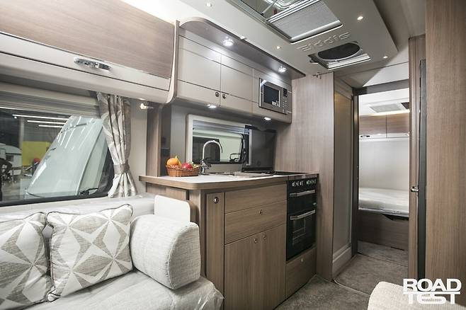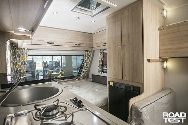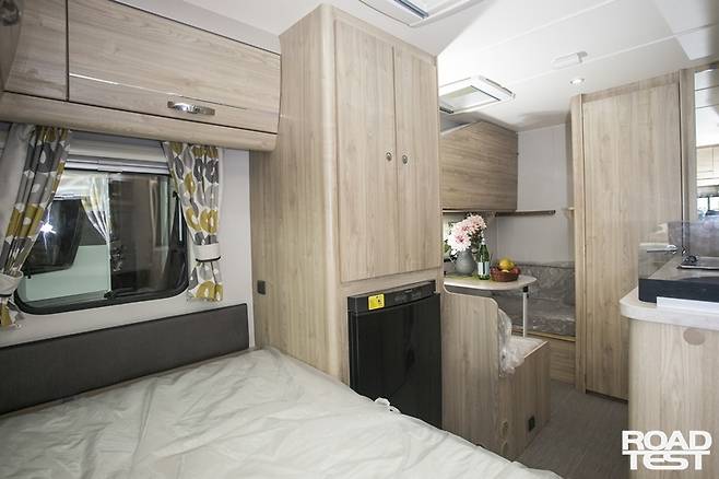 이 뿐만이 아니다.테이블 맞은편엔 예쁘장한 부엌이‘호감지수’를 쑥쑥 높인다.싱크대와 가스레인지,냉장고까지 마련했다.위쪽을 대리석으로 메꿔 모양과 기능까지 모두 챙겼다.호텔 객실과 다른 점은 바로 이 부분이다.집에서 간단한 식재료를 챙겨가 조리할 수 있는 게 특징이다.또한,카라반 옆에 어닝 옵션을 더하면 바깥에서 식사를 할 수도 있다.