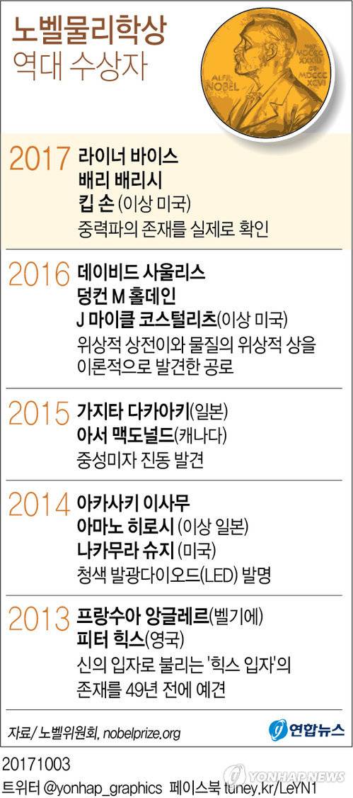 ![(서울=연합뉴스) 올해 노벨물리학상은 아인슈타인이 1세기 전 주장한 중력파의 존재를 실제로 확인한 고급레이저간섭계중력파관측소(라이고·LIGO) 연구진에게 돌아갔다. 왼쪽부터 라이너 바이스 미국 매사추세츠공과대 명예교수, 배리 배리시 캘리포니아공과대학(캘텍) 교수, 킵 손 캘텍 명예교수. 2017.10.3 [노벨위원회 홈페이지 캡처=연합뉴스] photo@yna.co.kr](https://img3.daumcdn.net/thumb/R658x0.q70/?fname=https://t1.daumcdn.net/news/201710/03/yonhap/20171003211144210nsja.jpg)
