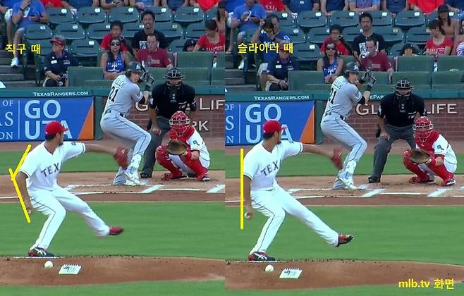 1회 홈런을 맞은 옐리치 타석이다. (왼쪽) 빠른 볼을 던질 때는 오른쪽 팔꿈치가 완전히 펴지지 않는 모습이다. 반면 슬라이더 때는 곧게 팔이 펴진다. 이걸 당사자는 ‘멈춤 동작이 있다’라고 한 것 같다. 어쩌면 타자 시각에서는 그게 맞는 표현일 지 모른다. 뒤에 가려진 팔의 움직임에 대한 느낌이기 때문이다.