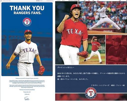 그러자 레인저스가 화답했다. 일본의 요미우리 신문에 전면 광고를 실었다. “다르빗슈 유 님에게. 2012년 입단이래 당신이 이룬 수많은 업적과 팀에 대한 헌신에 마음으로부터 우러난 감사를 드립니다. 초일류의 퍼포먼스여, 고맙다.”