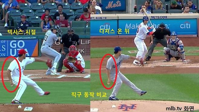 지적된 부분은 이렇다. 포심(직구)을 던질 때 표시가 난다는 얘기다. 본인은 ‘양 손에 잠시 멈춤 동작이 발견된다’고 표현했다. 물론 순간적인 움직임이어서 일반인의 눈으로 식별하기는 어렵다. <…구라다>가 정지 동작 화면을 캡처해서 비교해봤다.