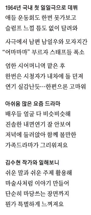 ▷나는 김수현을 국보라고 생각한다. 우선 어려운 말을 안 쓴다. 그냥 일상어를 쓰는데 언어의 마술사라 그런지 그게 방송에만 나오면 특별해진다. 어려운 주제도 아니고 우리들 살아가는 이야기를 쓴다. 그런데 김수현을 거치면 마당을 쓰는 장면도 특별해진다. 실제로 연기를 하면서 순간순간 감동할 수밖에 없다. 늙지 말고 영원히 글 쓰셨으면 좋겠다.