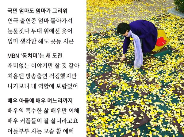 ▷어머니에 정답은 없다. 엄마라는 단어는 그것만으로도 좋지 않나. 듣는 것만으로도 콧등이 시큰한 이름. 희생을 위해 태어난 사람이 엄마다. 지금 내가 내일 모레 80세인데도 석양만 보면 엄마 생각이 난다. 내가 43세 때 엄마가 돌아가셨는데. 세실극장에서 연극 '홍당무'를 할 때였다. 펑펑 울다가 무대에 올라가서는 웃어야 했다. 방송국에서 엄마 관련 토크 프로그램을 하자는 제안을 몇 번 받았는데 안 한다고 했다. 눈물이 나서 못 할 것 같았다.