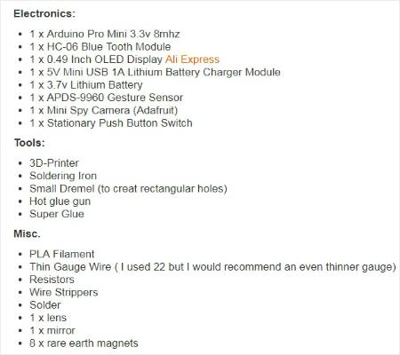 3.7v 리튬 배터리, APDS-9960 제스처 센서, 미니 스파이 카메라 1대, 고정 푸시 버튼 스위치 등의 전자부품을 인터넷과 전자부품 시장에서 쉽게 구입해 만들었습니다.