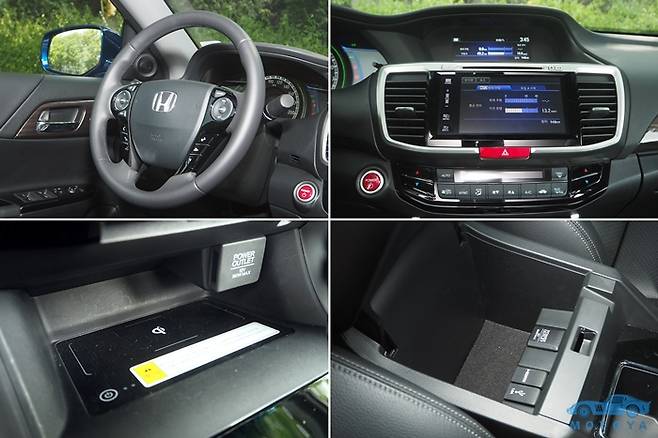실내는 페이스리프트 이후의 어코드와 크게 다르지 않다. 주차 브레이크는 여전히 수동 레버식이며, 상하단으로 나뉘어져 있는 디스플레이, 단순한 디자인의 대시보드 주변 등에 이르기까지, 익숙하고 전형적인 미국식 중형 패밀리 세단의 실내다. 하지만 하이브리드 시스템을 탑재하고 있다는 점 때문에 일반 모델과는 몇 가지의 차이가 있다. 안드로이드 기반의 신규 인포테인먼트 시스템을 적용하고 있으며, 애플 카플레이 등을 지원한다. 센터페시아 하단에는 Qi 규격의 무선충전 장치도 설치되어 있다.