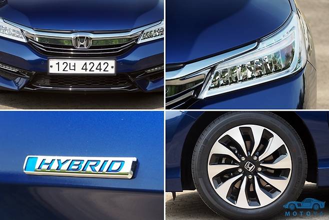 하이브리드 모델은 LED 헤드램프와 리어 콤비네이션 램프에 블루 익스텐션 렌즈가 적용되어 있고 라디에이터 그릴과 전면 범퍼 등에는 고광택 블랙 페인팅과 크롬 장식을 조합하여 보다 세련되면서도 화려한 분위기를 낸다. 테일파이프가 바깥으로 돌출되어 있지 않다. 또한 전용의 17인치 알로이 휠과 전용 사이드 스커트, 트렁크리드 스포일러 등을 더해졌다. 이렇게 완성된 어코드의 외관은 일반형 모델 보다 더욱 스포티한 인상을 준다. 전용 외장 색상인 코발트 블루의 색감도 인상적이다.