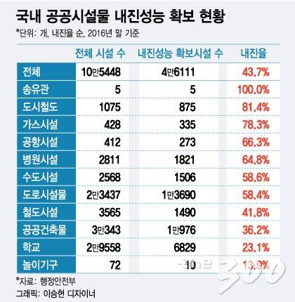 행안부가 지난 5월 발표한 '내진보강대책 추진결과 공시'에 따르면 전체 공공시설물의 내진율(2016년 기준)은 43.7%다. 도시철도가 81.4%로 가장 높고 학교시설은 23.1%로 전체 평균보다도 20% 포인트 낮다. 내진보강률은 2015년 대비 공공건축물이 1.1%, 도로시설물이 2.0%, 고속철도가 3.3%, 병원시설이 0.4% 증가하는 동안 학교 시설의 내진율은 0.3% 각각 증가했다.