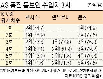 렉서스 랜드로버 메르세데스벤츠…. 국내 수입차 시장에서 애프터서비스(AS)가 최고 수준으로 꼽힌 업체들이다. 이들 3개사는 한국경제신문사가 지난 3년간 여섯 차례 시행한 ‘한경 수입차서비스지수(KICSI) 평가’에서 꾸준히 상위권에 올라 ‘AS 강자’임을 증명했다. KICSI 평가는 국내 수입차 브랜드 가운데 누적 판매량이 2만 대가 넘는 15개사를 대상으로 6개월에 한 번씩 이뤄진다.